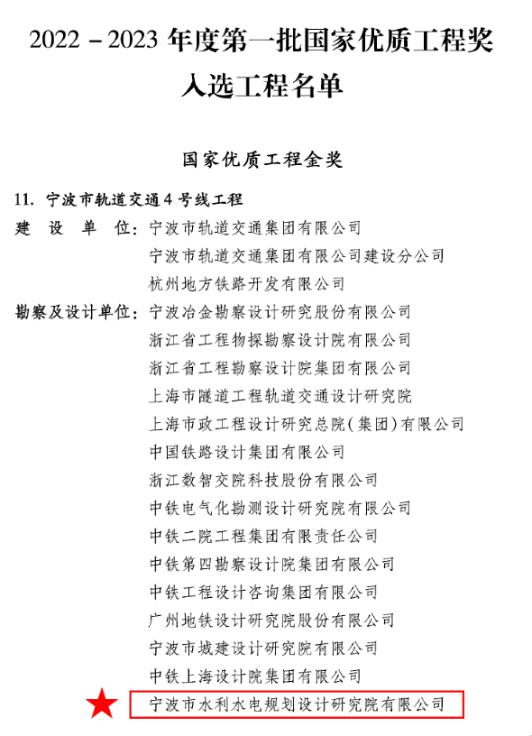 喜訊!我院參與設(shè)計的寧波軌道交通4號線工程榮獲國家優(yōu)質(zhì)工程金獎