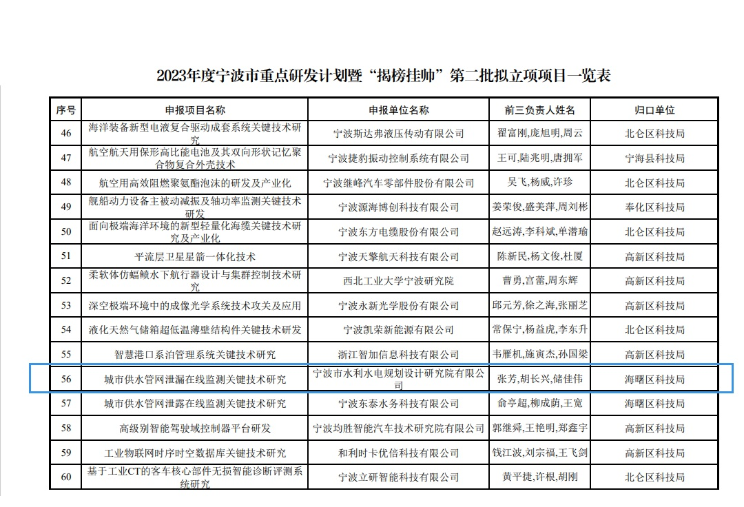 此前,我院“城市供水管網(wǎng)泄漏在線監(jiān)測(cè)關(guān)鍵技術(shù)研究”已入選寧波市重點(diǎn)研發(fā)計(jì)劃暨“揭榜掛帥”第二批擬立項(xiàng)項(xiàng)目。兩個(gè)項(xiàng)目合同總經(jīng)費(fèi)達(dá)4000萬(wàn)元。
