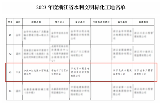 近日,經(jīng)浙江省水利廳2023年度浙江省水利文明標化工地名單公布,我院承擔全過程工程咨詢的寧波市江北區(qū)小西壩泵站工程喜獲“浙江省文明標化工地”稱號,成為寧波市水利行業(yè)的標桿工程。