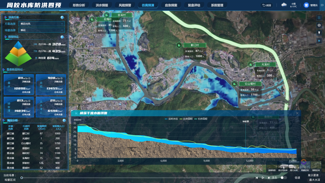 入庫1800多場歷史臺風(fēng)信息,通過臺風(fēng)路徑相似度匹配,獲取歷史臺風(fēng)周公宅水庫、皎口水庫庫區(qū)降雨網(wǎng)格化數(shù)據(jù),為預(yù)報和調(diào)度決策提供參考。建設(shè)鄞江流域產(chǎn)匯流模型、梯級水庫聯(lián)合調(diào)度模型和水庫下游一二維耦合水動力模型,通過水庫調(diào)度對下游防洪影響的正向預(yù)演,以及對上游庫區(qū)淹沒和大壩自身安全的逆向推演,動態(tài)推薦多目標(biāo)優(yōu)化調(diào)度方案,有力支撐水庫從前期預(yù)泄、中期錯峰到后期攔蓄的全過程調(diào)度決策。將傳統(tǒng)的各水庫獨立預(yù)報的流程進(jìn)行重塑,實現(xiàn)兩座水庫工作人員在同一平臺上協(xié)同操作、實時計算與快速分析,聯(lián)合預(yù)報調(diào)度方案的制定時間從原先的10分鐘縮減至目前的1—2分鐘,顯著提升了洪水預(yù)報效率。同時,周公宅水庫、皎口水庫高精度的洪水預(yù)報,為寧波市甬江流域一體化調(diào)度提供較為精確的上邊界條件,提高了下游平原河網(wǎng)的洪水預(yù)報精度,在近年的流域防洪中發(fā)揮了很好的實戰(zhàn)作用。